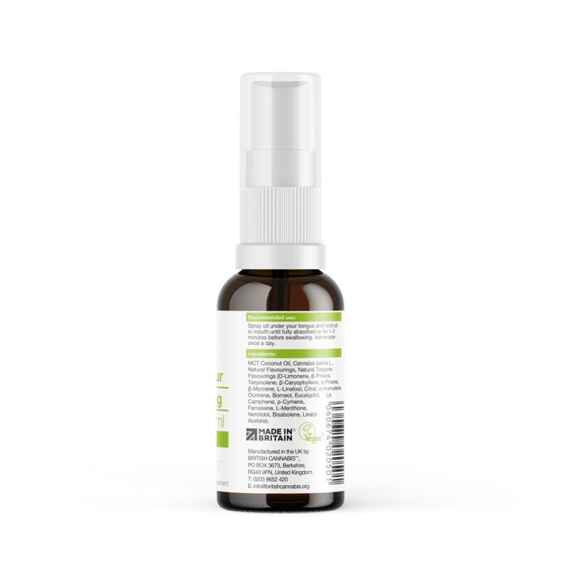 Ingredients: MCT Coconut Oil, Cannabis sativa L., Natural Flavourings, Natural Terpene Flavourings (D-Limonene, β-Pinene, Terpinolene, β-Caryophyllene, α-Pinene, β-Myrcene, L-Linalool, Citral, α-Humulene, Ocimene, Borneol, Eucalyptol, Camphene, ρ-Cymene, Farnesene, L-Menthone, Nerolidol, Bisabolene, Linalyl Acetate).