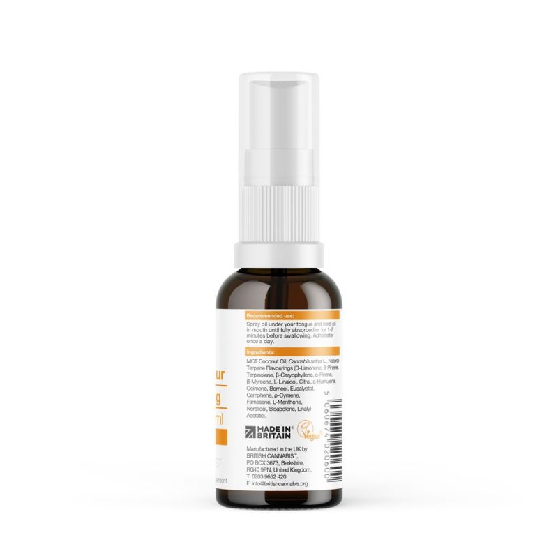 Ingredients: MCT Coconut Oil, Cannabis sativa L., Natural Terpene Flavourings (D-Limonene, β-Pinene, Terpinolene, β-Caryophyllene, α-Pinene, β-Myrcene, L-Linalool, Citral, α-Humulene, Ocimene, Borneol, Eucalyptol, Camphene, ρ-Cymene, Farnesene, L-Menthone, Nerolidol, Bisabolene, Linalyl Acetate).