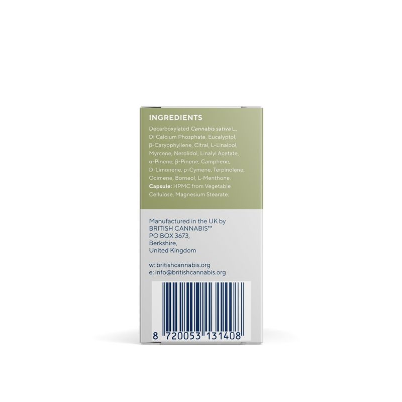 Ingredients: Decarboxylated Cannabis sativa L., Di Calcium Phosphate, Eucalyptol, β-Caryophyllene, Citral, L-Linalool, Myrcene, Nerolidol, Linalyl Acetate, α-Pinene, β-Pinene, Camphene, D-Limonene, ρ-Cymene, Terpinolene, Ocimene, Borneol, L-Menthone.
