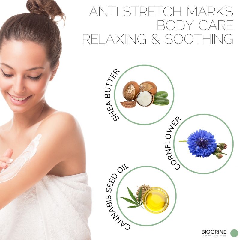 The combination of the latter with CBD oil and shea butter prevents skin dryness and heals small skin problems while reducing stretch marks, wrinkles and cracks.
