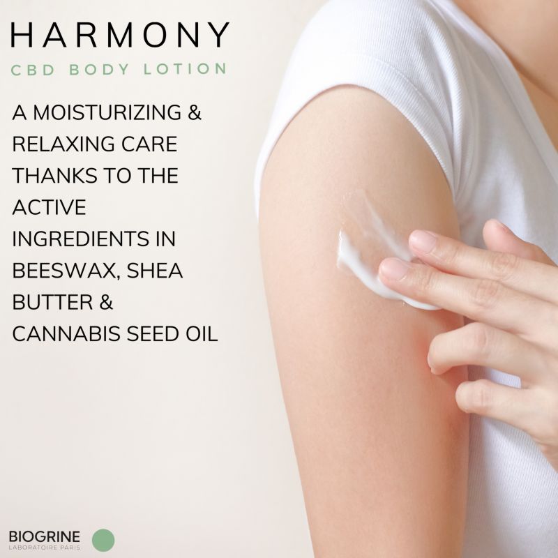 The CBD body lotion of our "Harmony" range brings hydration and protection to the skin thanks to its content of vitamin A present in the beeswax.