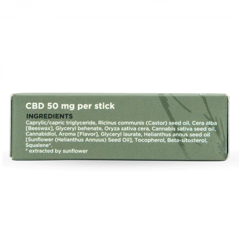 Caprylic/capric triglyceride, Ricinus communis (Castor) seed oil, Cera Alba [Beeswax], Glyceryl Behenate, Oryza sativa cera, Cannabis sativa seed oil, Cannabidiol, Aroma [flavor], Glyceryl laurate, Hellanthus annus seed oil, [Sunflower (Heliantus Annus) Seed oil], Tocopherol, Beta-sitosterol, Squalene*.