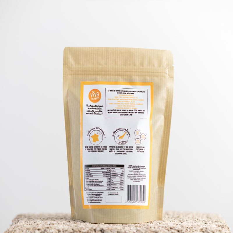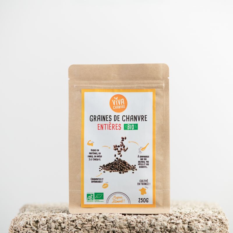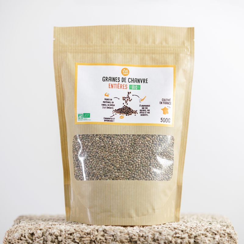 VIVA CHANVRE transforme des graines de chanvre biologique français. Le chanvre est une source extraordinaire d'acides gras essentiels (Oméga 3, Oméga 6 dans un rapport 1:3), de protéines (avec 9 acides aminés essentiels), de fibres, de vitamine E et de minéraux. Ses graines peuvent être consommées entières, décortiquées, en poudre ou sous forme d'huile. Les graines de chanvre sont un excellent choix pour une alimentation complète et équilibrée et offrent un goût délicieux. Ils sont sans allergènes, sans gluten et sans lactose. Tous nos produits sont certifiés ECOCERT (FR-BIO-01)